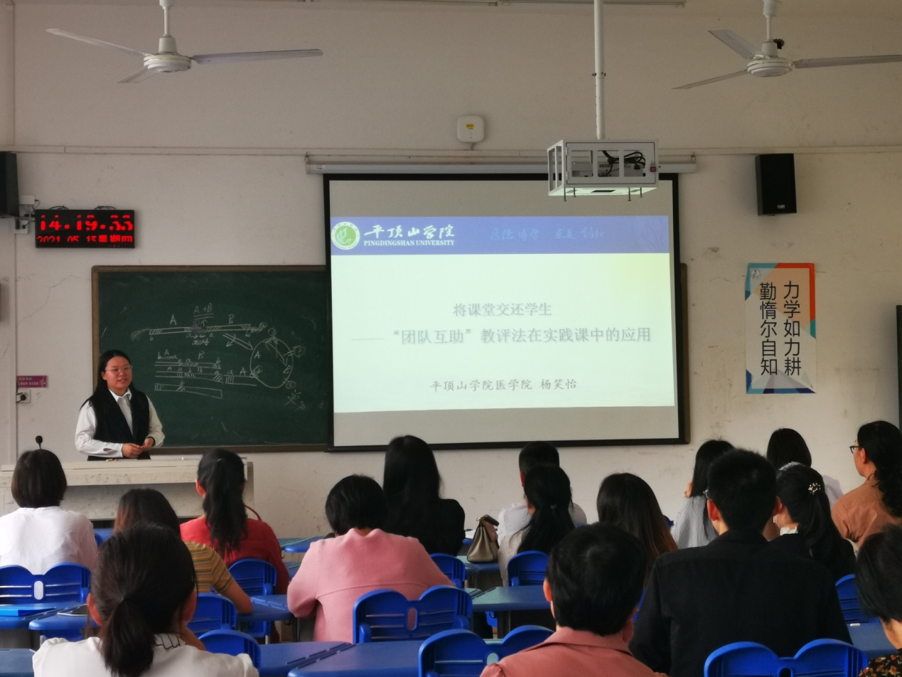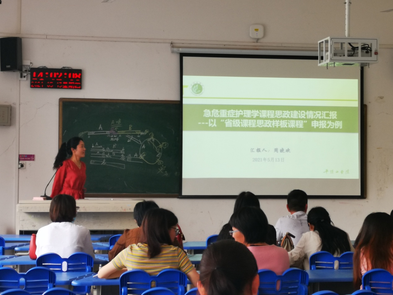 首先,护理系周晓欢老师以急危重症护理学课程建设为例,分享了申报省级“战疫”类课程思政样板课程的宝贵经验。周晓欢老师分别从建设基础、目标方法、建设效果、建设规划等方面,详细介绍了急危重症护理学课程思政建设情况和申报书填写的技巧。临床医学系杨笑怡老师以“将课堂交还员工---‘团队互助’教评学在实践课中的应用”为题,分享了“团队互助”教评法的理论基础、实训课中的实践经验及遇到的困难及解决办法。