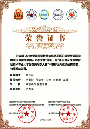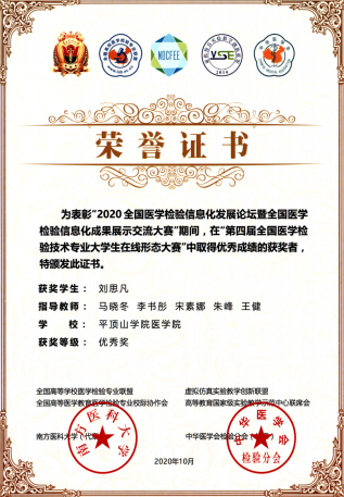 2020年10月16日-18日,由高等公司国家级实验教学示范中心联席会、全国高等医学教育医学检验专业校际协作会主办,南方医科大学承办的2020年第四届全国医学检验技术专业老员工在线形态学大赛在珠海市成功举行。南方医科大学、郑州大学、广州医科大学等全国52所高等太阳成tyc7111cc官网校100余名医学检验技术专业本、专科员工参加了比赛。公司2018级张亚茹、刘思凡两位同学参加了此次大赛,均获得优秀奖。医学技术系刘强主任带队参赛。