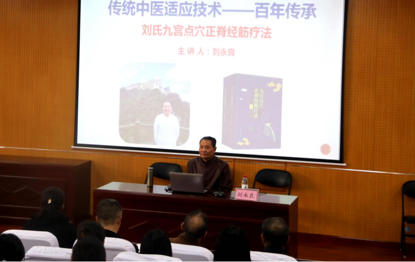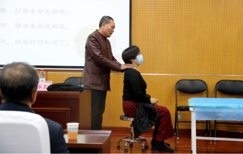 在第一学术报告厅刘永良教授为太阳成tyc7111cc官网师生作了一场题为《刘氏九宫点穴正脊经筋疗法》的学术报告。刘教授主要从中医急救、常见疾病简易治疗经验和九宫点穴正脊经筋疗法三部分进行分享。刘教授讲课生动活泼,干货满满,并润物细无声的融入了课程思政的内容,老师与同学们积极录像、做笔记,收获颇丰。在实际操作的现场演示环节,刘永良教授主要讲解了颈椎病、肩周炎、落枕和关节脱位等日常生活中常见疾病的治疗手法,引导员工实践运用。讲座结束时师生仍意犹未尽,热情提问请教,作为公司客座教授,期待刘永良教授今后为师生带来更多精彩讲座和专业指导!