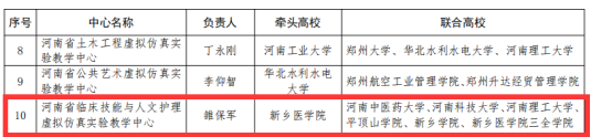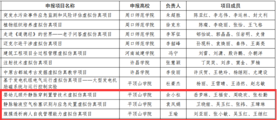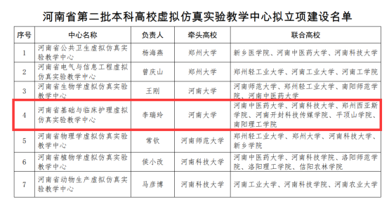 余小柱、袁凤娟、王瑜等老师负责的《婴幼儿颈外静脉穿刺置管技术虚拟仿真项目》、《静脉输液空气栓塞识别与应急处置虚拟仿真项目》、《腹膜透析病人自我管理能力虚拟仿真项目》立项建设河南省第二批本科高校虚拟仿真实验教学项目。