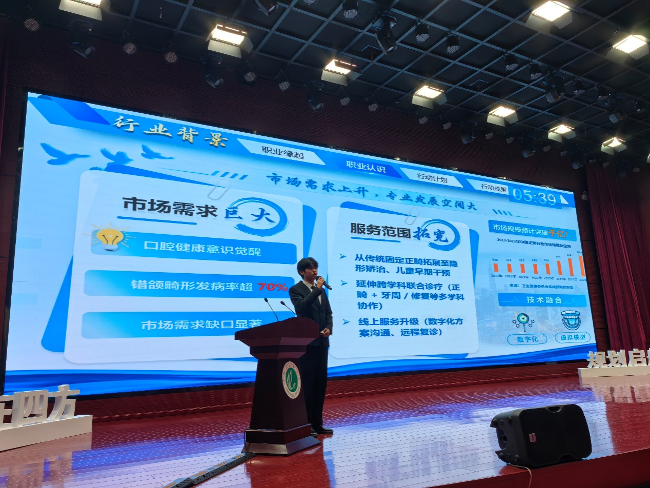 决赛现场,选手们结合个人职业目标,通过PPT展演的方式,系统阐述职业规划路径。来自临床医学、口腔医学专业的选手,立足行业发展趋势,从市场需求、技能提升、实践路径等维度,展现清晰的职业目标与可行的行动计划,并围绕“职业认知深度”、“规划可行性”、“创新能力”等维度进行现场作答,展现扎实的专业素养与临场应变能力。