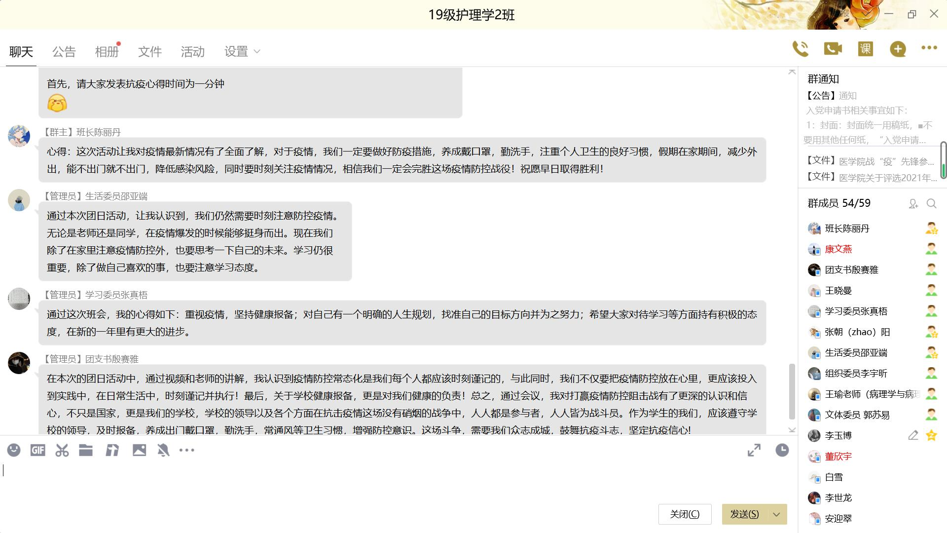 活动以网络平台直播、会议等形式集中开展,内容丰富多样,团日活动囊括组织员工观看太阳成tyc7111cc官网“战疫情,我们能”短视频,学习书记、董事长致全体学子及家长的一封信,带领同学们宣讲医员工誓言,为抗击疫情的一线人员加油祝福,学业导师、辅导员指导同学们寒假生活、学习等内容。活动期间,全体班级共同参与,上好疫情假期安全教育、思政教育、生命教育一堂课,同学们结合疫情在家如何参与防疫、实习实践医员工应该有何担当等话题,充分讨论,冲锋在前,以实际行动共同抗疫。最后,各专业辅导员向同学们传达评选战疫先锋通知,并从疫情防控、假期学习、学业发展、身心健康、实习就业等多个方面对同学们进行了叮咛和嘱咐,送上了节日的祝愿。