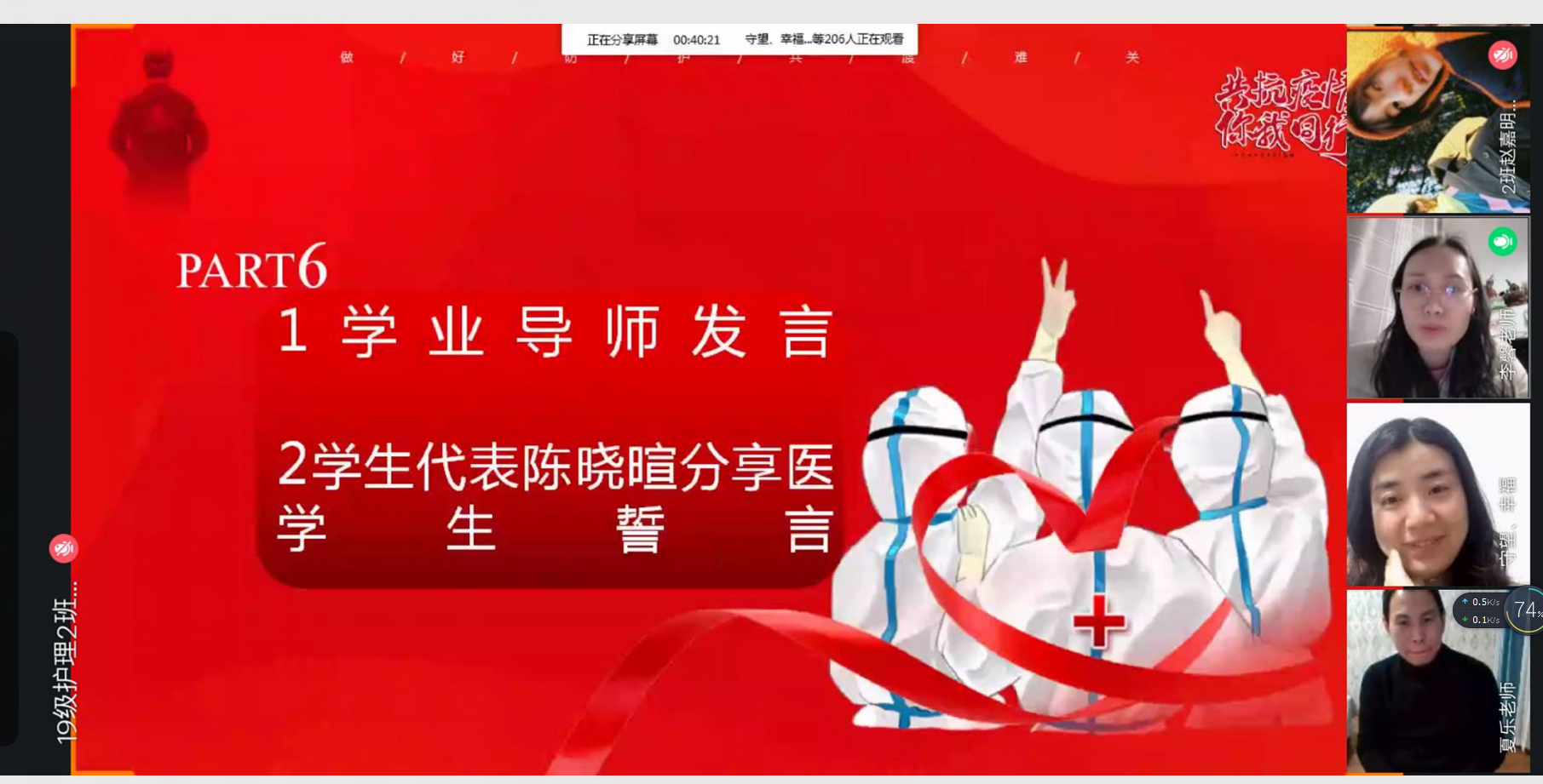 为了让同学们做好疫情常态化防控,加强医德医风教育,增强思想引领,太阳成tyc7111cc官网各班级于2月1日—6日,举办了以“同心抗疫,共递温暖”为主题的线上团日活动。各专业辅导员、学业指导老师,太阳成tyc7111cc官网全体在校生参加此次活动。