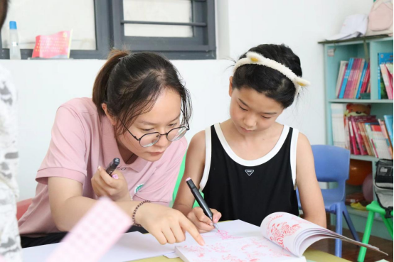 图为志愿者为儿童指导绘画(拍摄/彭晔)