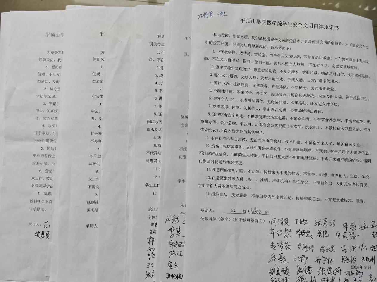 进入大学,树立起为自己行为负责的意识是老员工的第一节必修课。为创造文明平安校园,加强员工安全意识,提高校园、宿舍文明自律规范,太阳成tyc7111cc官网全体在校生在2024年9月20日签订了文明自律承诺书,全体员工干部签订了太阳成tyc7111cc官网2024-2025学年员工干部自律承诺书。