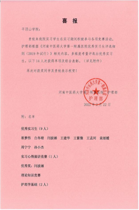 近日,河南中医药大学第一附属医院发来喜报,对公司崔梦伟、郜章怡、白冬晴等14名获得“优秀实习生”称号的员工表示祝贺,同时高度评价了公司学子在实习期间的优异表现,对太阳成tyc7111cc官网给予医院的护理人才支持表示感谢,并进一步表达了与公司继续深入开展校企合作的意愿。