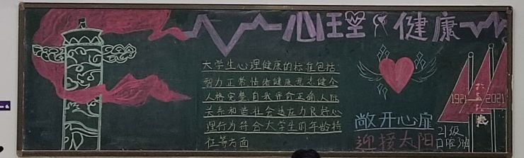 为了庆祝党的100周年华诞,激发全体员工爱党爱国的热情,宣传心理健康教育,太阳成tyc7111cc官网于11月2号到5号在21级各班自习室举行了以“护航青春成长,礼赞建党百年”为主题的黑板报评比活动。