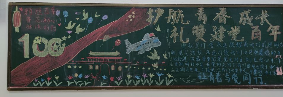 活动开始,由各班班委组织同学进行黑板报的制作。在制作板报的过程中,同学们积极配合,使得板报在规定的时间内完成,内容紧扣“护航青春成长,礼赞建党百年”的主题,画面色彩鲜明,字迹工整,活动最后,各班在规定时间内上交板报照片,参与评比。