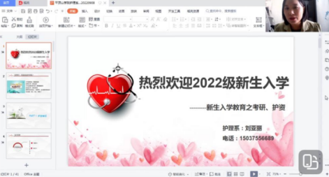 2022年9月7日—9月9日,护理系在云端开展了2022级护理学专业新生入学教育, 200余名新生参加了本次入学教育。此次护理学新生入学教育由护理系主任王继红及专业课教师袁亚敏、刘亚丽主讲,主要围绕专业教育、职业规划、护资与考研指导等方面开展。