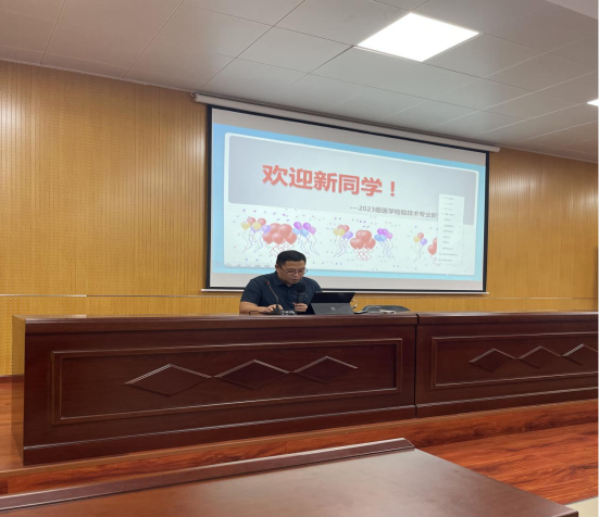 9月19日晚,太阳成tyc7111cc官网学术报告二号厅里洋溢着喜庆、欢乐的气氛,医学技术系2023级新生入学教育在这里如期举行。会议由医学技术系刘强主任主持,副经理夏西超出席,医学技术系专业教师及2023级医学技术系全体新生参加了会议。