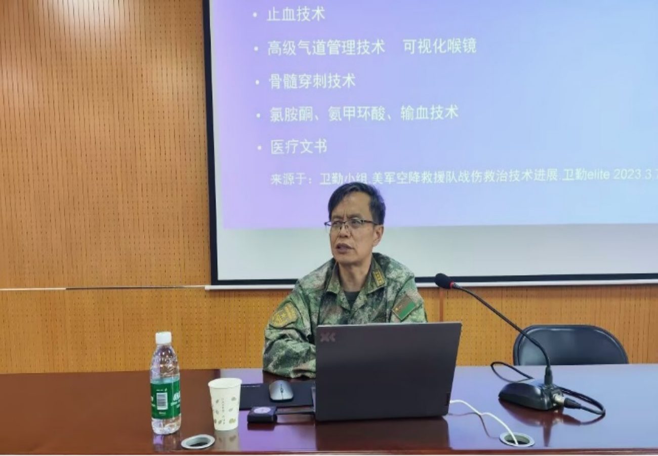 讲座伊始,袁跃彬主任以外军经典战例与俄乌冲突为切入点,深刻剖析现代战争“高技术对抗、高伤亡密度、无前后方界限”的新特征,强调“和平年代的卫勤准备是国家安全的隐性防线”。他对比外军卫勤力量构成,指出我国需重点提升伤员后送体系构建、战场生存能力及损伤控制手术等实战技能培训,并特别提及美军空降救援队战伤救治技术中的止血技术、高级气道管理等核心模块,为公司团队建设提供“平战结合”的发展思路。